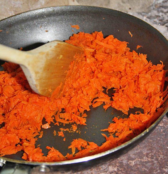 Измельчаю тушёные и ставлю в сотейнике уваривать.