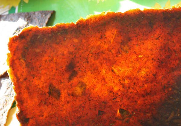 Пастила готова! Вкус приятный, овощной, кисленький. Посолена в меру, пивом запивать не требуется. Можно нарезать и хранить маленькими пластинками, а можно и целым пластом.