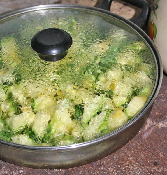 Сначала тушу патиссоны в собственном соку — я взяла молодые и не очищала кожицу.