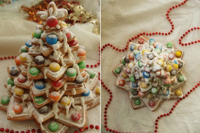 Готовое печенье остуди и укрась белковой глазурью, для этого взбей белок перепелиного яйца с сахарной пудрой. Когда глазурь полностью высохнет и перестанет липнуть, приступай к сборке елочки.