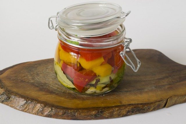 Заполняем баночку овощами – укладываем слоями кусочки тыквы, нарезанный перец и стручки горького перца. Сверху кладём веточку кинзы и небольшую палочку корицы, длинной примерно 5 сантиметров. Затем наливаем уксус 9%.