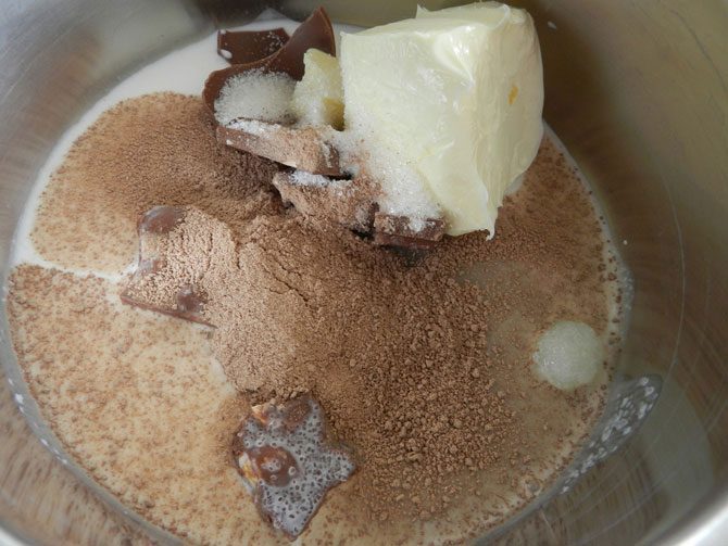 В сотейник выливаем молоко, добавляем масло, 2/3 шоколада, какао-порошок, сахарный песок. Постоянно помешивая, доводим до кипения и снимаем с огня.