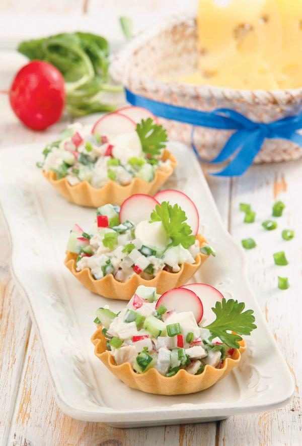 2. Лук вымыть, обсушить и нарезать маленькими колечками. Зелень нарубить. Подготовленные ингредиенты перемешать с йогуртом, посолить и поперчить. Разложить по тарталеткам и подавать на стол.