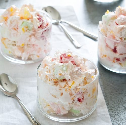 В большой миске взбейте йогурт и сливки.Добавьте остальные ингредиенты.Перед подачей охладите.
