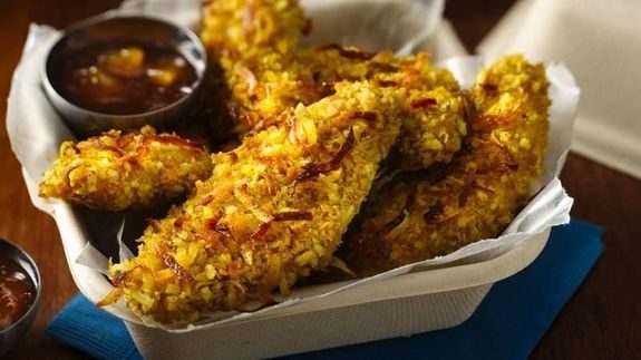 В азиатских странах кокосовая стружка считается традиционным вариантом панировки. Почему бы и нам не использовать ее в приготовлении куриной грудки? Экзотический плод придает этому блюду приятный аромат, а вустерский соус — пикантный вкус. Подавайте хрустящие куриные палочки с рисом или используйте в качестве самостоятельной закуски.