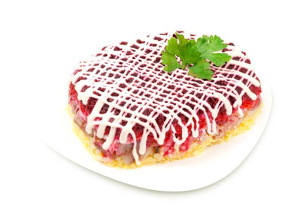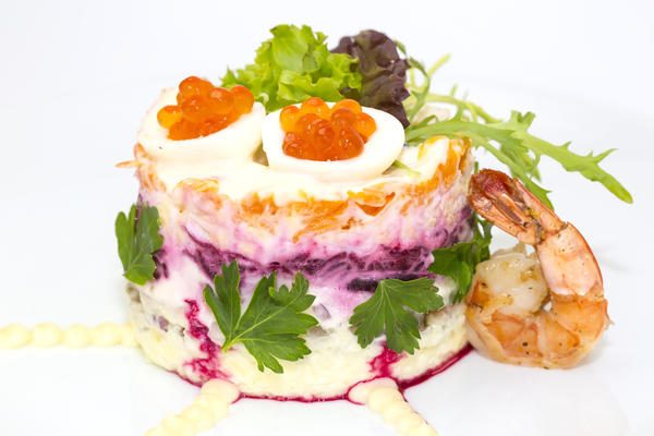 Сельди под шубой, заправленной соусом на основе желатина, можно придать очаровательный вид с помощью любой красивой формы. Рецепт приготовления такого салата вы найдете в статье Кулинарный мастер-класс: селедка под шубой по-новому.