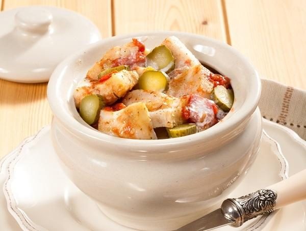 Репчатый лук очистить, мелко нарезать и обжарить на растительном масле. Духовку нагреть до 200 °С. Картофель очистить, вымыть, нарезать дольками и уложить в горшочки вместе с луком. Слегка посолить, поперчить, залить небольшим количеством воды, накрыть и поставить в духовку на 15 мин.Рыбное филе нарезать небольшими кусочками, огурцы – кружочками. Добавить в горшочки к овощам вместе с томатным соусом и сливками. При необходимость долить немного воды. Тушить еще 15 мин. В готовое блюдо можно добавить рубленую зелень.