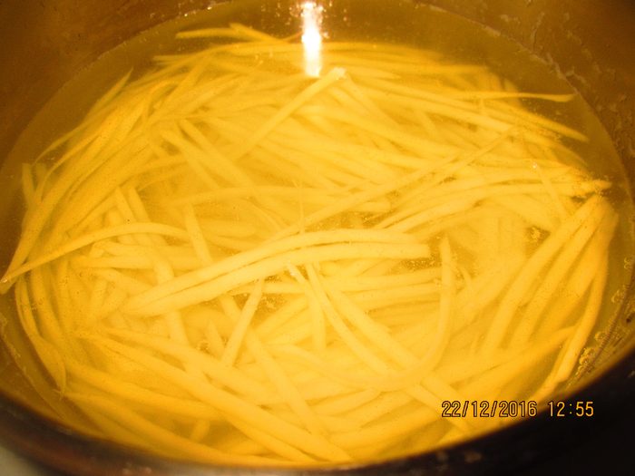 Картофель очистить и нарезать длинными тоненькими брусочками и промыть в холодной воде, выложить в тарелку.
