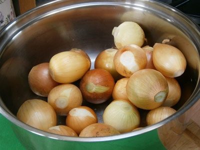Затем включаем плиту на средний уровень, ставим на нее большую 5 литровую кастрюлю с 2 литрами проточной воды и доводим ее до кипения. Пока закипает вода, перебираем 3 – 4 килограмма репчатого лука одновременно удаляя испорченные и подгнившие клубни. После при помощи ножа для нарезки сырых овощей поочередно срезаем с каждой луковицы хвостики, корневище и удаляем кожуру. Скидываем лук в мойку, промываем под холодной проточной водой от песка и любых других загрязнений и перекладываем в глубокую миску.