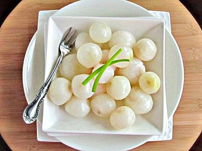 Когда вода закипит, аккуратно опускаем в нее луковицы и бланшируем их в течение 2 – 3 минут. За счет этого процесса они потеряют свою горечь, а также из лука выйдут излишки воздуха, которые скопились между сочными чешуйками. Теперь действуем быстро, набираем в глубокую миску примерно 2 литра холодной проточной воды и перекладываем в нее бланшированный лук при помощи шумовки. Довольно резкий перепад температуры остановит термическую обработку овощей, таким образом, сохраняя все полезные витамины, микро и макроэлементы, а также их вкус, запах и цвет.