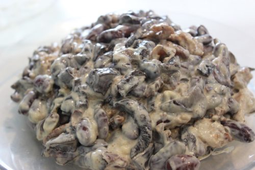 Я с вареным яйцом делала, т.е. грибы фасоль, яйцо, майонез. Вкусно.