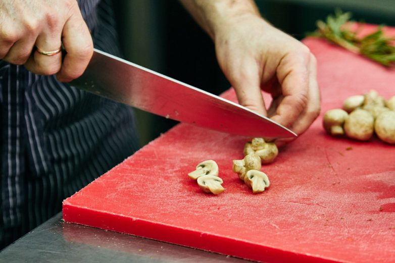 Маринованные шампиньоны разрезать пополам, крупные грибочки – на 4 части.