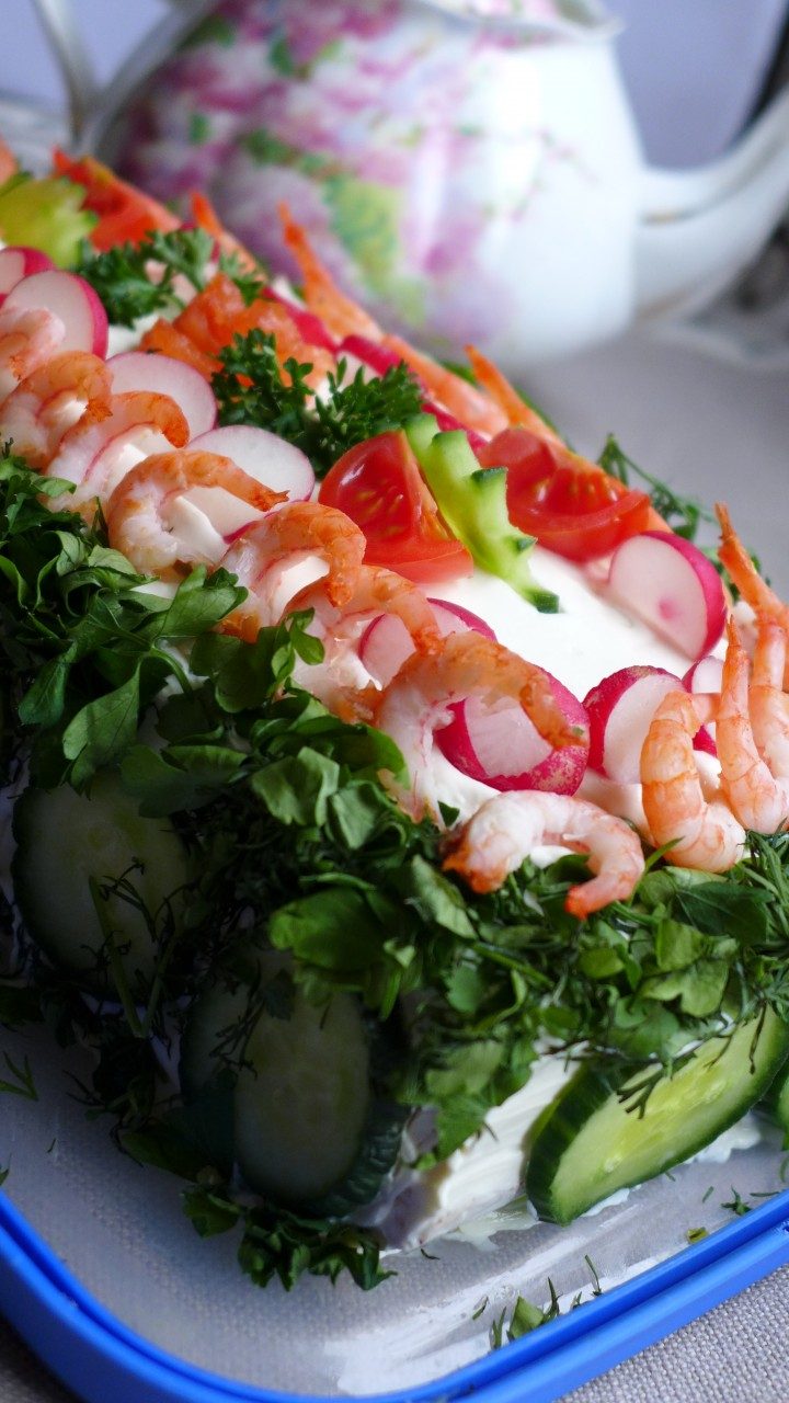 Украшаем торт на свой вкус: ртварными креветками, кусочками лосося, зеленью, листьями салата, ломтиками помидоров, кружочками тонко нарезанной редиски и огурца.