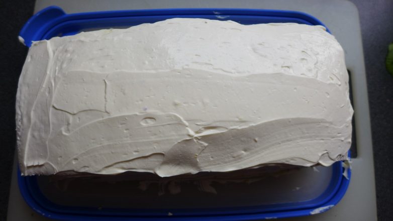 Кладем последний четвертый корж. В блендере смешиваем сметану и мягкий сливочный сыр до однородной массы. Обмазываем наш бутербродный торт со всех сторон, не оставляя нигде просветов.
