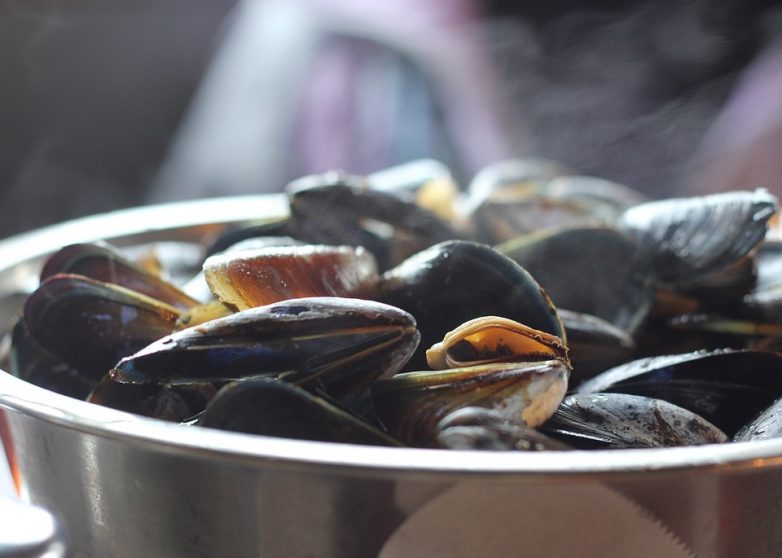 Следующий этап приготовления – добавление очищенных и вымытых мидий. Рис с мидиями и овощами следует залить горячим рыбным бульоном, после чего добавить измельченный чеснок, посолить и поперчить плов. Все ингредиенты добавлены, остается медленно томить плов на среднем огне до полной готовности риса.
