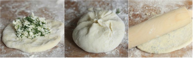 Сыр натри, добавь измельченную зелень, посоли, если необходимо.Тесто раздели на 6 одинаковых комочков, каждому из которых придай форму лепешки диаметром до 10 сантиметров. Выложи по центру каждой лепешки 2 ст. л. начинки, защипай края. Получившийся мешочек придави ладонью и раскатай скалкой в тонкий круг диаметром 20 сантиметров.