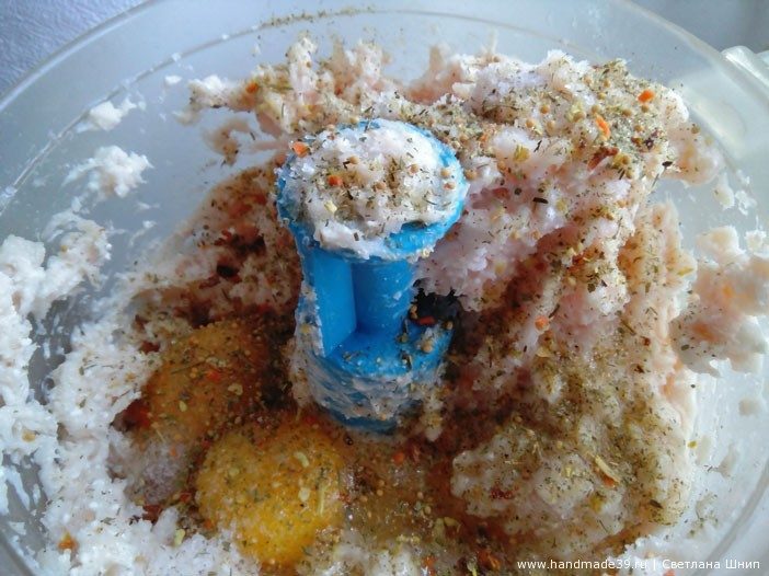Добавить яйца, соль и специи, подсолнечное масло. Снова всё перемолоть.
