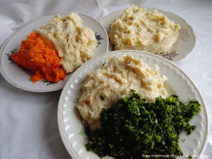 Делим подготовленный фарш на 3 части. В одну часть добавить тёртую на мелкой тёрке морковь, в другую добавить измельчённый на блендере шпинат, а третью оставить так, как есть.