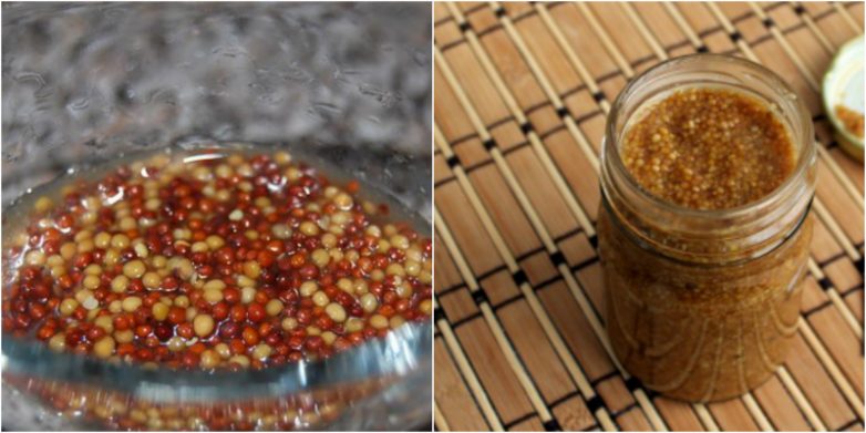 Зерна горчицы промой, замочи на ночь в смеси воды и уксуса.
