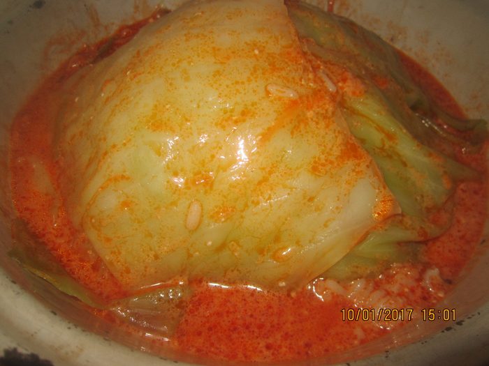 Смешиваем майонез, сметану и томатный кетчуп, добавляем воду (примерно пол-литра) и заливаем этой смесью кочан.