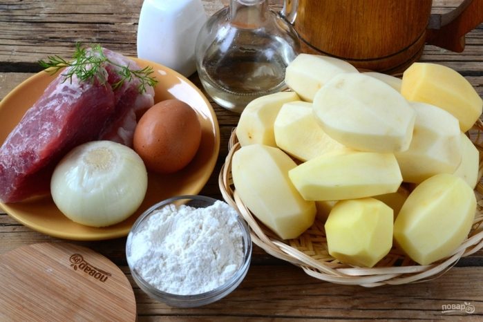 Подготовьте все необходимые ингредиенты. Картофель и лук очистите и промойте. В оригинале нужно использовать бекон, но мне больше нравится вариант со свиной вырезкой.