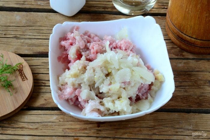Мясо пропустите вместе с луком через мясорубку.