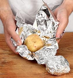 Картофель помыть щеткой, завернуть в фольгу и запечь в разогретой до 180°С духовке до мягкости, 30–40 мин.