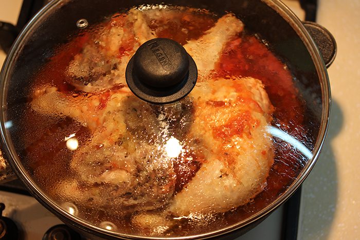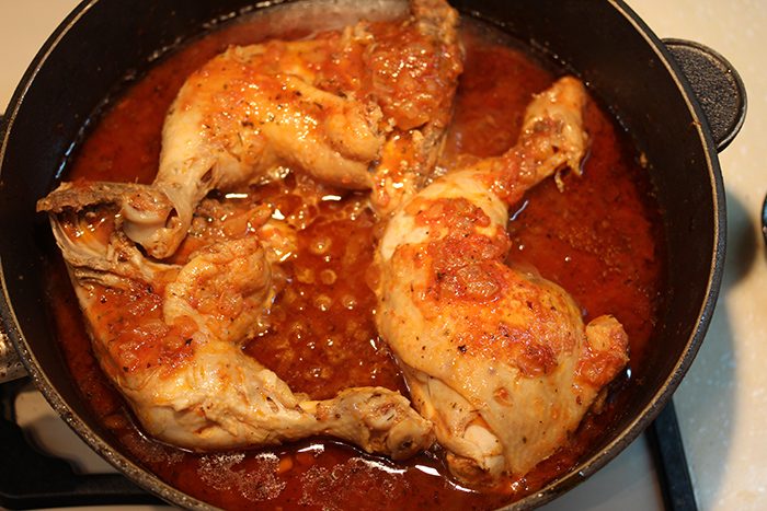 Перемешиваем и тушим под крышкой минут 40, или пока кости у куриных ножек не начнут обнажаться.