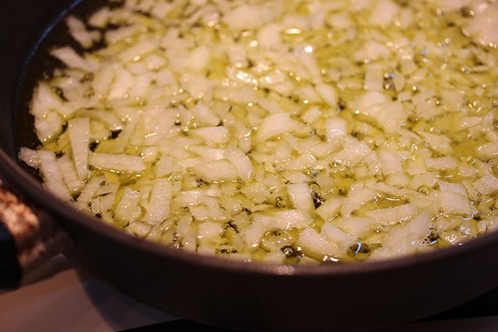 Обжариваем мелко нарезанный лук в масле до прозрачности.
