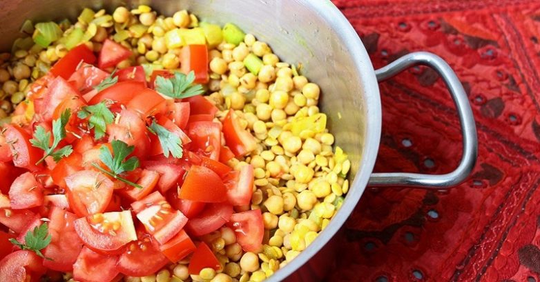 Приготовь из сырой луковицы пюре при помощи блендера. Помести кастрюлю на огонь и выложи в нее пюре.Сними кожицу с помидоров и приготовь томатное пюре. Добавь томатное пюре к луковому, сразу же добавь половину нарезанной петрушки — 50 г.Выложи в кастрюлю отваренный до полуготовности нут и зеленую чечевицу, нарезанное кусочками мясо. Без всяких сомнений можно использовать курицу.