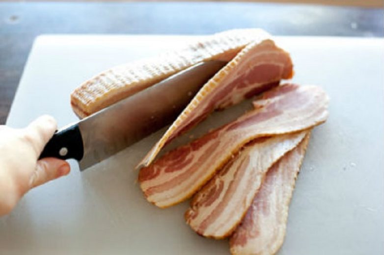 На пищевую пленку выложи внахлест бекон, затем помести на него куриную грудку. На этом этапе посоли и поперчи мясо.