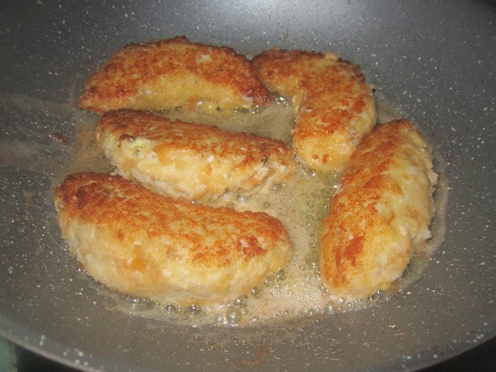 Фарш приготовить, как указано выше, из оставшейся ¼ части количества рыбы, но только прибавить к нему рубленных шампиньонов, заправить его густым соусом томат и остудить. Разделать кнелевую массу на соусной или столовой ложке, положить в середину каждой порции приготовленный фарш и хорошенько замазать горячим ножом, чтобы фарша не было видно снаружи. Затем, отварив кнель в соленом кипятке, как обыкновенно отваривается кнель, т.е на пару, не кипятя, вынуть ее шумовкой на сито, отсушить, а потом запанировать в яйцах и сухарях и зажарить в отколерованном фритюре.