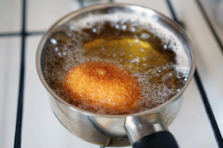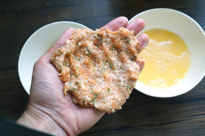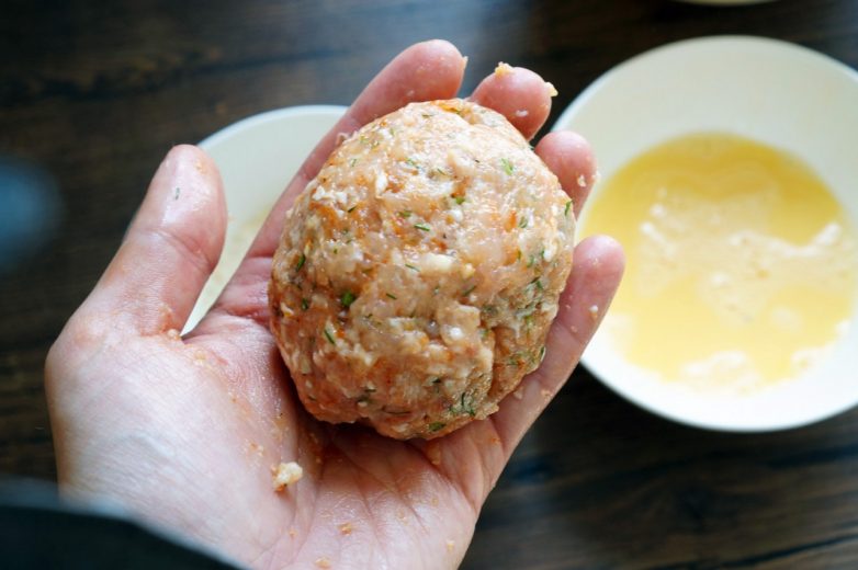 Всё, что остаётся, это обвалять полученный шарик сначала в сухарях, потом в яичной смеси и заново сухари, яичная смесь и снова сухари.