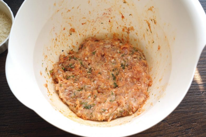 Дальше в большой миске смешайте куриный фарш (в оригинале используется фарш для сосисок мясных, но я люблю более мягкий куриный вкус, да и к яйцу как-то символичнее), специи и травы. Я использовать острый чили, укроп, соль и свежемолотый перец. Но всё на ваше усмотрение.