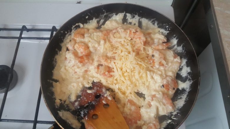 А в итоге получилось пережаренное и комками (на нижнем фото). Чеснок обжариваем на масле 15-20 секунд, затем удаляем и на этом масле обжариваем креветки ровно 1 минуту, вливаем сливки( яйца здесь неуместны, иначе это будет непонятный омлет), даем покипеть еще 2 минуты. Добавляем тертый сыр и быстро перемешиваем, чтоб сыр расплавился, посыпаем укропом. Блюдо готово.