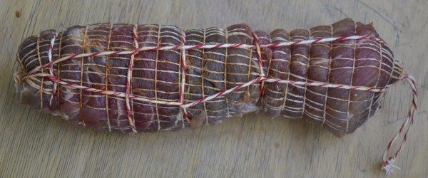 P.S. Мне изначально попался не совсем удачный кусок окорока. Он был практически плоским, всего лишь сантиметра 4 толщиной, а удобнее использовать кусочек, похожий на толстый брусок. При упаковке в сетку пришлось свернуть его рулетиком. Батончик получился не совсем ровным по калибру, но как показала практика, на вкус это не повлияло. За две недели мясо приняло форму сетки, батон стал круглым и практически цельным. Шов склеился, но его хорошо видно на разрезе. Вкус нежный, в меру солёный. Рекомендую!