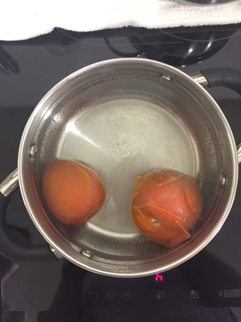 Делаем крестообразный надрез в верхней части помидора, кладем их в кастрюлю с водой, кипятим минуты 2-3, потом под холодную воду, снимаем кожуру и вырезаем твердую сердцевину и размельчаем в блендере.