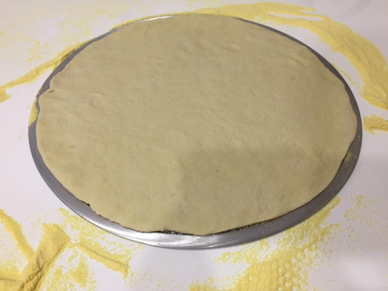 Далее посыпаем мукой поверхность (лучше для этого использовать кукурузную муку, меньше разлетается и нету привкуса в готовой пиццы)