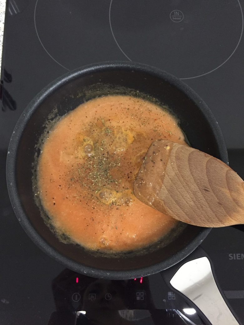 На сковородке разогреваем 1 ст.л. оливкового масла, быстро обжариваем мелко натертый чеснок, добавляем измельченные помидоры и специи, тушим минуты 2-3 и выключаем. Все соус готов.