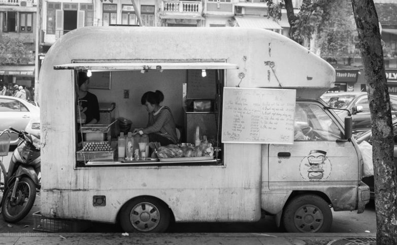Фургончик во Вьетнаме. Если присмотреться, можно даже увидеть расценки. Например, «xúc xích đức việt» (сытная вьетнамская колбаска) — 12000 донгов (31 рубль), «bánh mì xúc xích» (та же колбаска, только в тесте и с зеленью —фактически, хот-дог) — 20000 донгов (53 рубля)