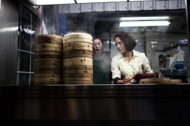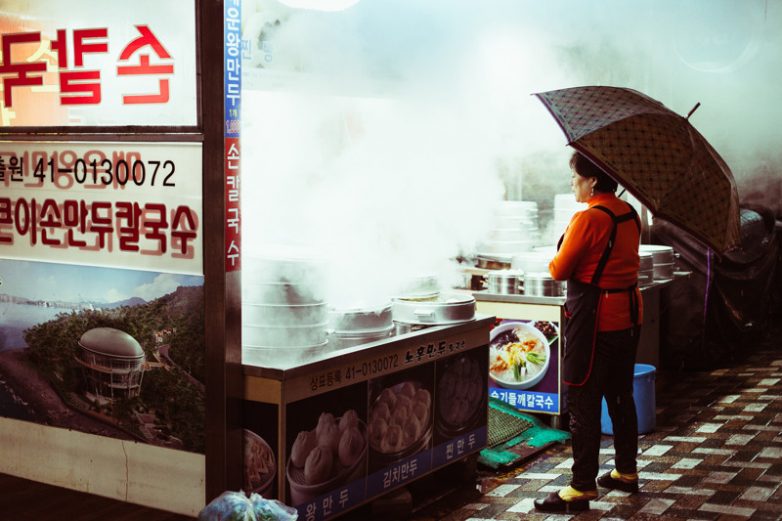 Источник: www.flickr.comТе же паровые корзины, только теперь Южная Корея. Готовка на пару в таких объёмах приводит к появлению конденсата на стенах и потолке — работнице точки даже пришлось раскрыть зонт.