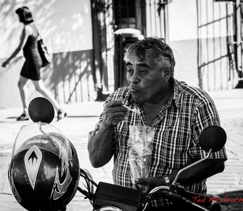Оксака (юг Мексики). Мотоциклист остановился у уличного ларька, чтобы приобрести местный фастфуд: смесь кусочков нескольких фруктов со специями. Подаётся это кушанье в пластиковом стаканчике. Кажется, покупатель всем доволен.