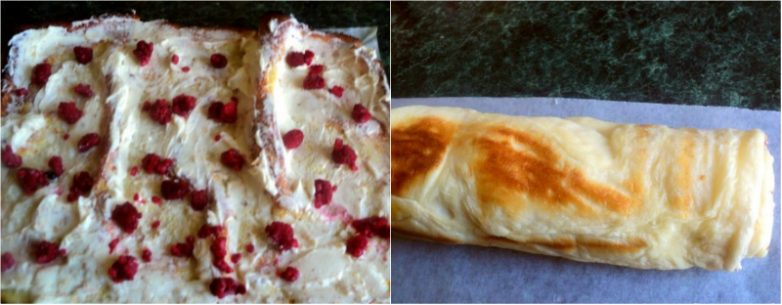 Для начинки творог разотри с сахаром. Если масса вышла суховатой, добавь пару ложек сметаны или йогурта. Смажь блин начинкой, добавь ягоды, сверни в рулет. Для подачи рулет нарежь кусочками и посыпь сахарной пудрой.