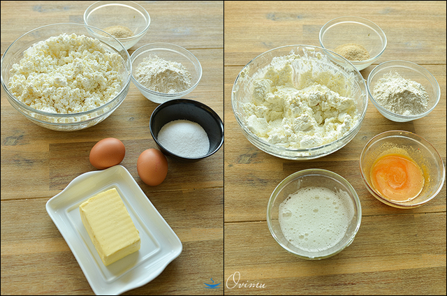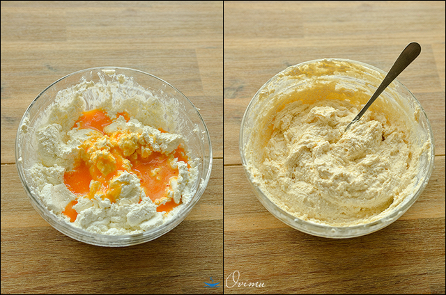 Творог пропускаем через мясорубку или перетираем через сито. Отделяем желток от белка. Сахар перетираем с желтком, белок взбиваем в пену.
