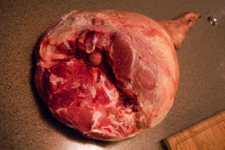 Внимательный читатель мог заметить, что на засолку я укладывал две лапы, а сегодня речь шла только об одной. Произошёл как раз тот случай, о котором я говорил выше. Дело в том, что раньше мы брали мясо у знакомых фермеров, а в этот раз взяли у официалов (у мелких частников сейчас не сезон). И я не обратил внимание на одну мелочь. На лапах около копыт были вот такие надрезы: