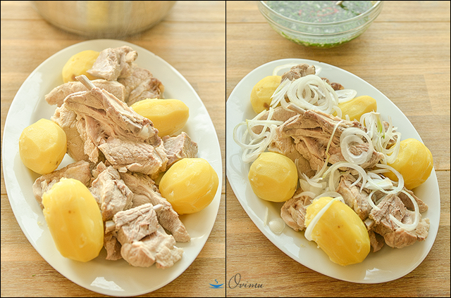 Достали из бульона на блюдо мясо и картошку.