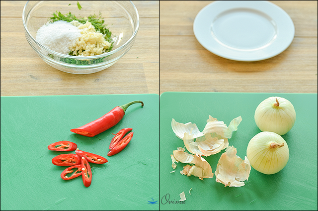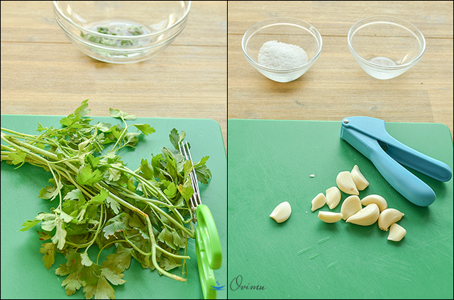 Во время варки займемся лёком. Возьмем маленькую мисочку. Мелко нарежем зелень, затем выдавим головку чеснока, пару столовых ложек соли, красный перец.