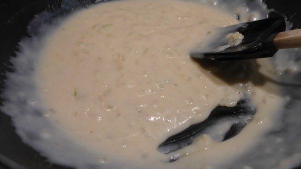 Уменьшить огонь до минимума, к полученной массе добавить половину молочно-тунцовой смеси (около 175 мл),