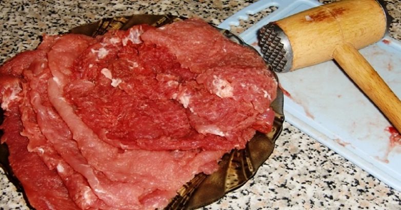 Хорошенько отбей мясо. Взбей яйца с помощью вилки или венчика, хорошо посоли и поперчи яичную смесь.