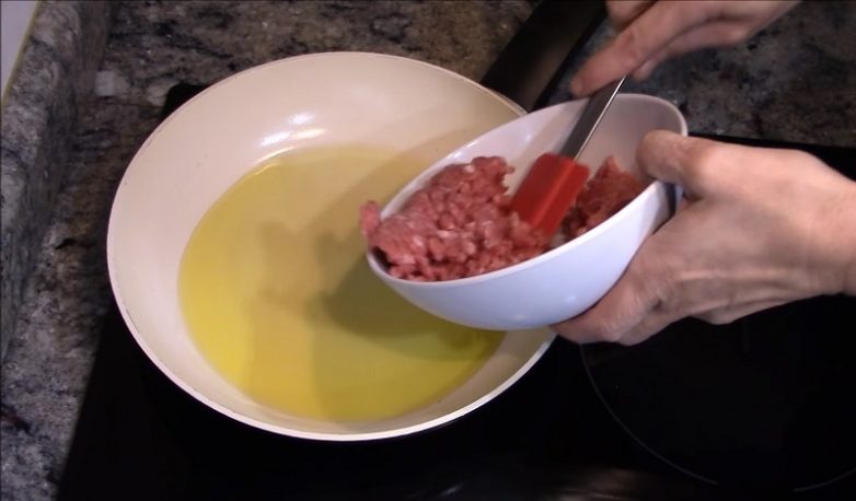 Поставь на средний огонь сковородку с оливковым или подсолнечным маслом, нагрей сковороду и положи в нее фарш. Разомни все комочки.